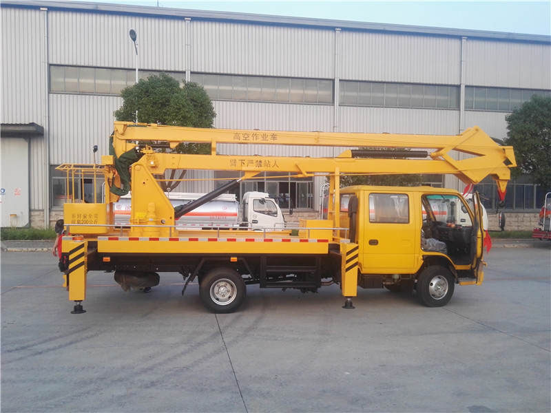底盘配置:五十铃双排不翻转驾驶室,轿车化内饰,轴距3815mm,五十铃发动机国五发动机,配置五十铃MSB五档变速器,冷暖空调,标配方向助力,双排前桥2吨,后桥4.8吨,7.00-16尼龙胎,带USB接口 五十铃高空作业车作业高度为18米,液压360度全回转,三节折叠臂,单液压举升缸,带双向平衡阀,电控操作举升臂,四支液压油缸可调式支腿带双向液压锁(支腿操作为手动操作,可单独**),带1吨吊钩.
